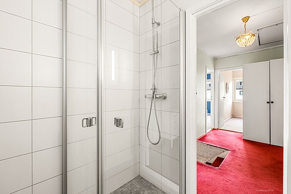 Bad: Baderom i 2. etasje oppgradert/ renovert i år 2014, arbeidene er utført i regi av innleide foretak. Overflater vegger med fliser og himling (innvendige tak) med malte flater. Overflater gulv med fliser på våtrom med varmekabler. Det er plastsluk og banemembran med ukjent utførelse. Våtrom inneholder følgende sanitærutstyr, dusjnisje med dører og 1- greps blandebatteri, klosett, servant montert i baderomsinnredning med dører og skuffer og 1-greps blandebatteri og speil med lys. Våtrom med mekanisk ventilasjon, med manglende tilluft via luftespalter i dør eller lignende.