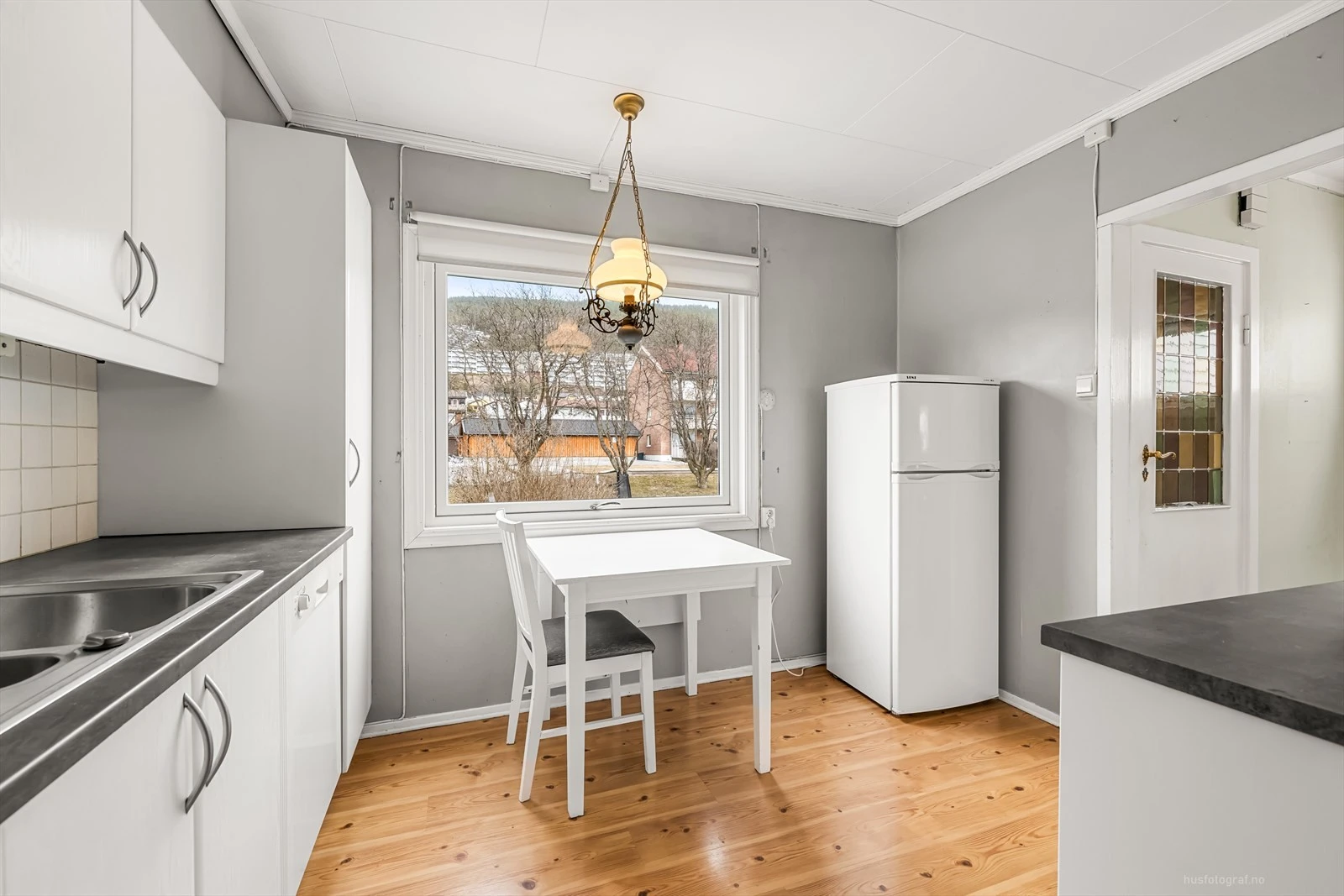 Komfyr, kjøleskap og oppvaskmaskin følger med.