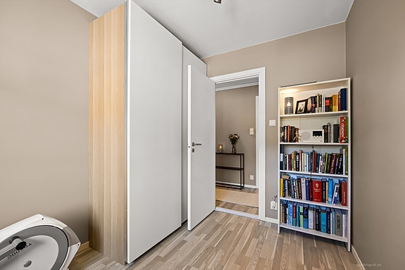 Taklamper, hyller på bad, skap i gang og på begge soverom, samt knagger i gang medfølger. Tv-benk medfølger i utgangspunktet ikke.