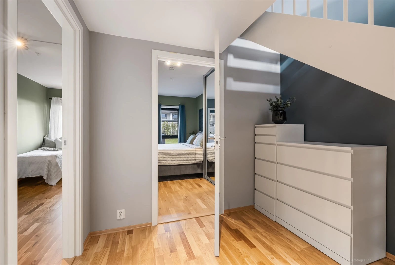 Velkommen til Buskerudveien 219C en gjennomgående lys og trivelig 3-roms andelsleilighet som strekker seg over to etasjer. Leiligheten holder en god standard og er godt vedlikeholdt, med en praktisk og funksjonell planløsning. Hovedetasjen består av en romslig stue med utgang til vestvendt balkong med svært gode solforhold på ettermiddag og kveld perfekt for å nyte rolige sommerkvelder. Fra kjøkkenet har du utgang til en egen balkong med morgensol, ideell for å starte dagen med en kaffekopp i fredelige omgivelser. Leiligheten har to soverom, og fra det ene soverommet er det direkte adkomst til en hyggelig terrasseplatting som ligger i tilknytning til felles hageareal et fint sted å trekke seg tilbake eller slippe barna ut i grønne omgivelser. I tillegg har leiligheten parkeringsplass i felles garasjeanlegg med elbillader en praktisk og fremtidsrettet løsning for deg med elbil. Dette er en flott mulighet for deg som ønsker en romslig og velholdt leilighet med flere uteplasser, gode solforhold og en rolig beliggenhet samtidig som du bor sentralt med nærhet til det meste.