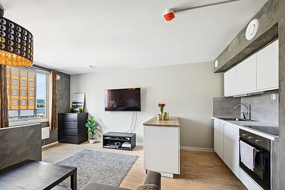 Stue/kjøkken: Stuen har fin plass til møblement, og har hyggelig utsyn utover elven. Kjøkkeninnredningen er praktisk utformet med kjøkkenøy. Her er det integrert kjøleskap, platetopp, stekeovn, vannstoppsystem og komfyrvakt.