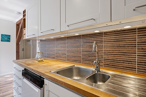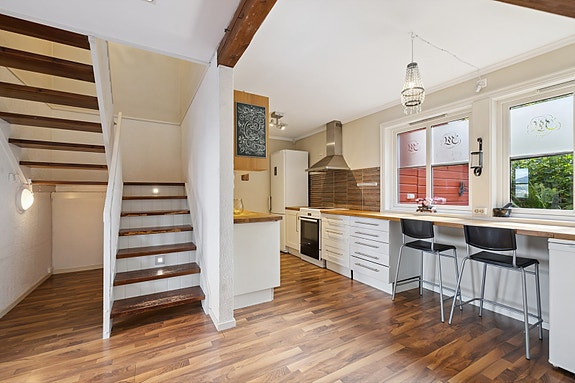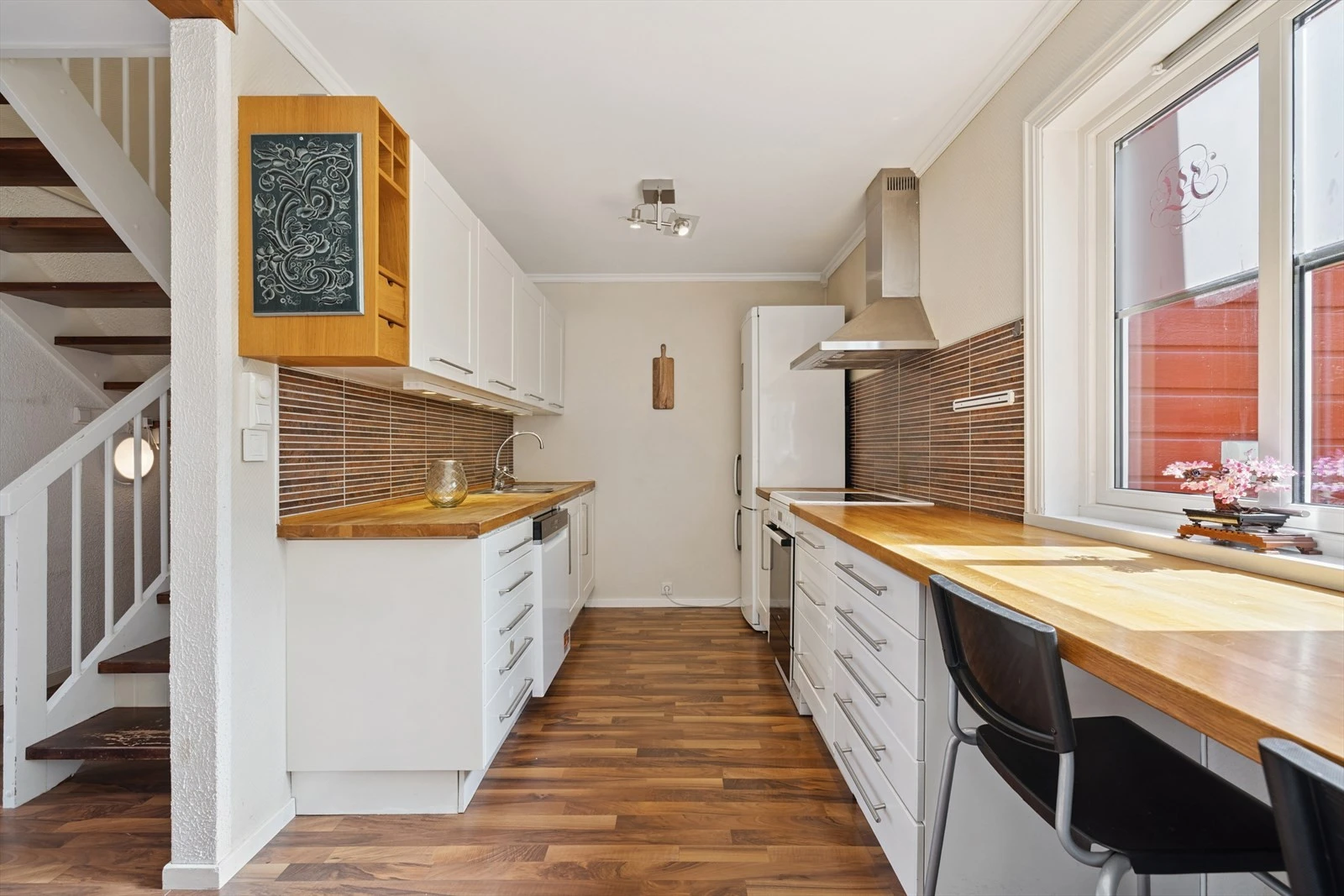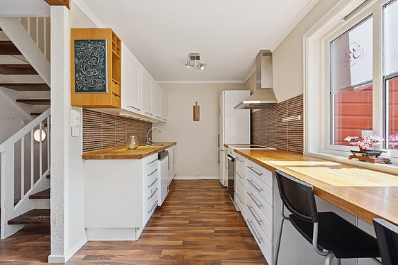 Kjøkken: Velholdt og moderne kjøkken med fine profilerte fronter. Samtlige hvitevarer på kjøkkenet medfølger handelen. Benkeplate er av heltre, og det er kjøkkenventilator med avtrekk ut.