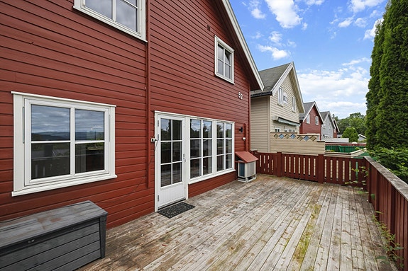 Utvendig tekket med pappshingel. Siden taket (takkonstruksjon, taktekking og skorstein) kun er observert fra bakkenivå, er vurderingen begrenset av dette. Det er ikke sikkerhetsmessig forsvarlig å bevege seg ut på taket eller observere fra stige. Selv om det ikke er avdekket skader under befaringen, betyr ikke dette at det ikke foreligger skader som en besiktigelse på taket kan avdekke. Vær oppmerksom på denne risikoen. En undersøkelse av taket kan utføres av en fagperson under tilstrekkelige sikkerhetsforhold. Takrenner og nedløpsrør av lakkert stål. Yttervegger består av tre/bindingsverk, med utvendig trepanel. Takkonstruksjonen har A-takstoler i tre. Bygningen har malte trevinduer med 2-lags glass. Bygningen har malt hovedytterdør og malt balkongdør i tre. Terrasse på ca 28 m² oppført i trekonstruksjon med adkomst fra stue. Rekkverk med stående bord. Rekkverk er ca 90 cm høyt. Utvendig trapp av treverk med rekkverk på en side. Det er ikke fremlagt vedlikeholdsplan på felles deler i sameiet. Det er videre ikke kjent om det settes av midler til vedlikehold og oppgraderinger av felles bygningsdeler.