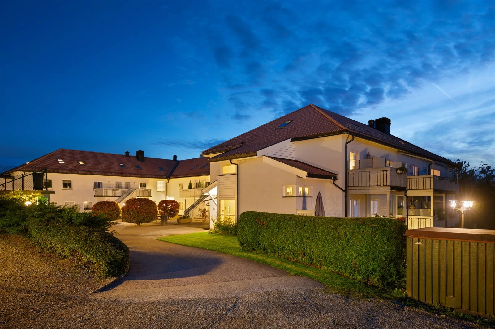 Sameiets tomt er pent opparbeidet med gressplen, beplantninger og prydbusker. Asfaltert innkjørsel og gårdsplass.