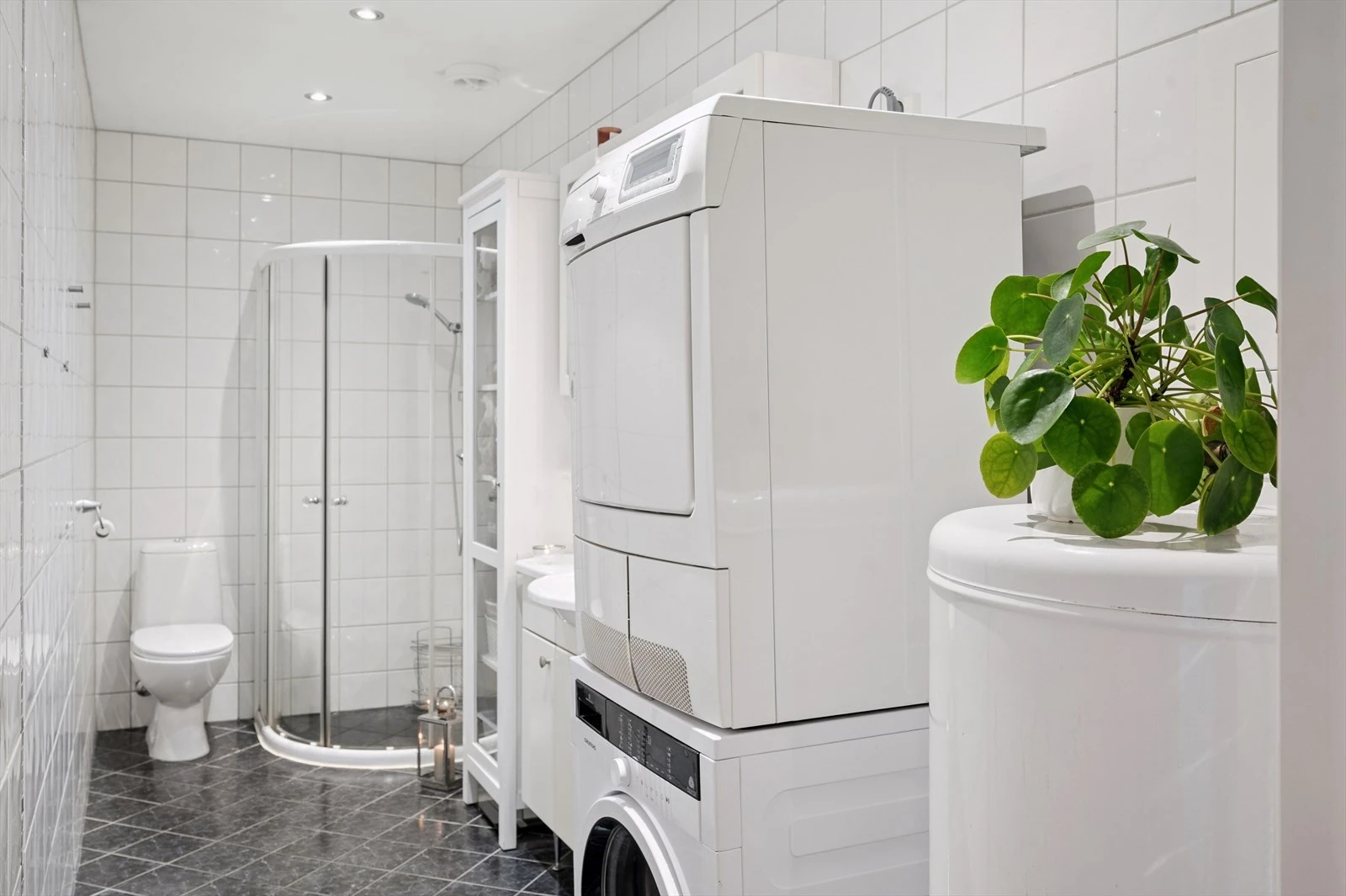 Baderom: Romslig og pent flislagt baderom med varmekabler. Innredning bestående av nedfelt servant, toalett, dusjvegger/hjørne og opplegg for vaskemaskin. Frittstående skap på badet kan medfølge handelen om ønskelig.