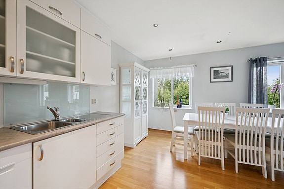Kjøkken: Pent kjøkken med innredning av glatte fronter. Det er kjøl/fryseskap, oppvaskmaskin, komfyr og kjøkkenventilator med avtrekk ut. Samtlige hvitevarer på kjøkkenet medfølger handelen.