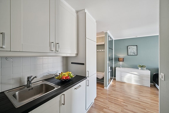 Kjøkken: Pent og lyst kjøkken med innredning av profilerte fronter. Benkeplaten er av laminat som er malt og foliert. Det er kjøl/fryseskap, oppvaskmaskin, induksjonstopp, stekeovn og vannstoppsystem. Det er kjøkkenventilator med kullfilter.